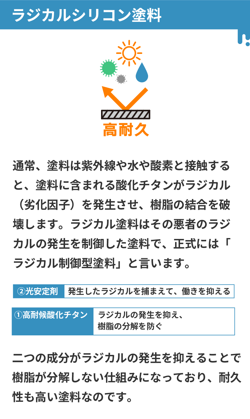 藻やカビの発生を防ぎ、塗膜の表層に特殊なコーティング技術を与えることで、汚れが付着しにくい塗膜にします。